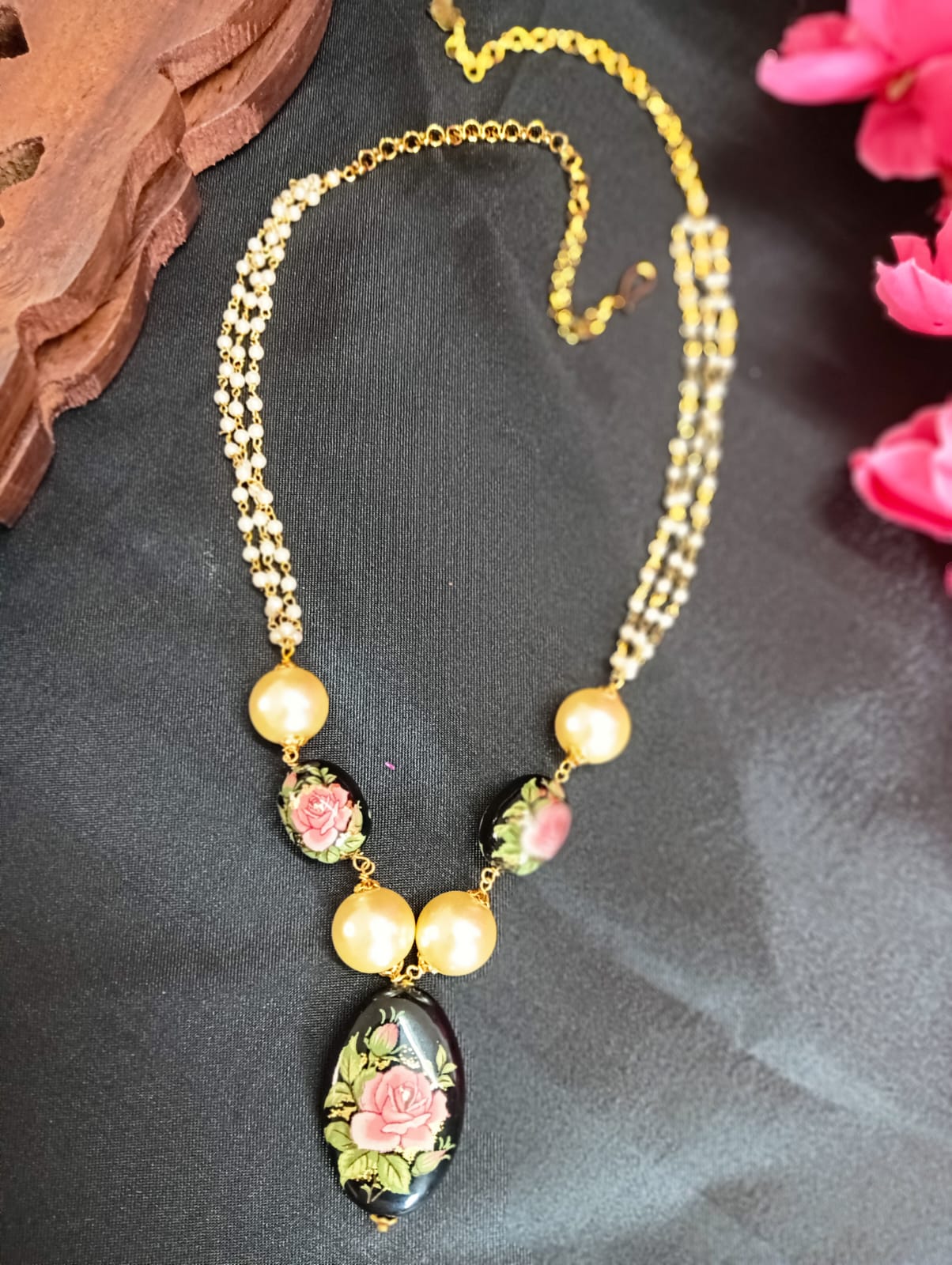 - Material: Hand-painted floral beads, golden faux pearls, golden-plated link chain with mini pearl strands